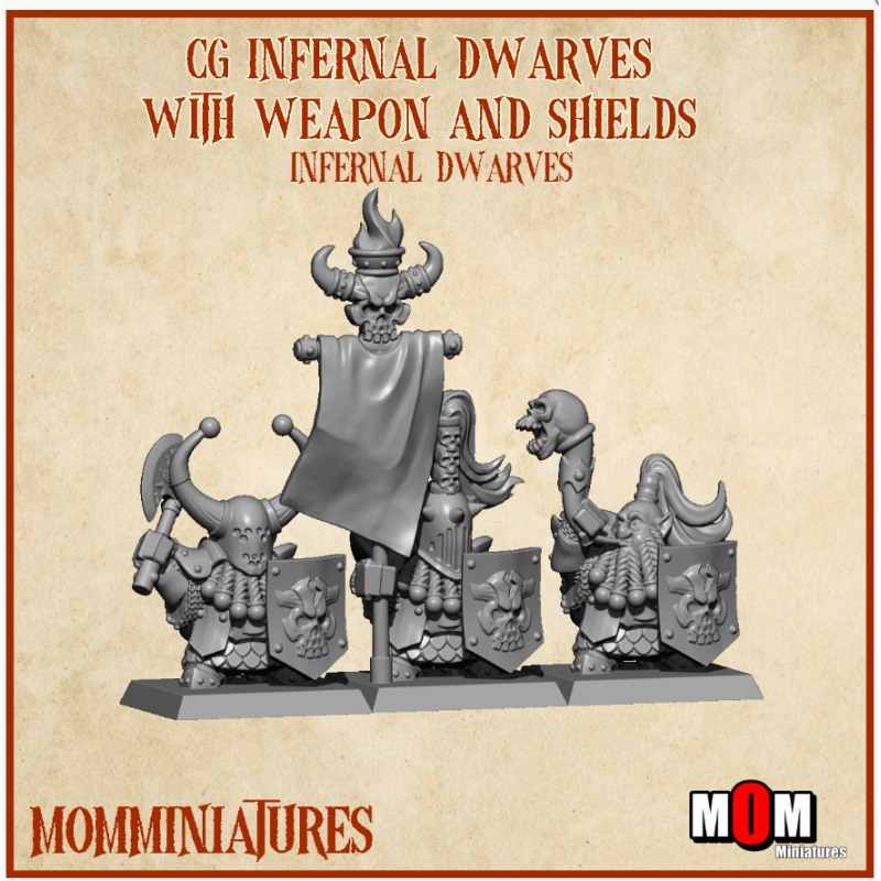 Grupo de mando de Enanos infernales con arma de mano y escudo. Enanos infernales